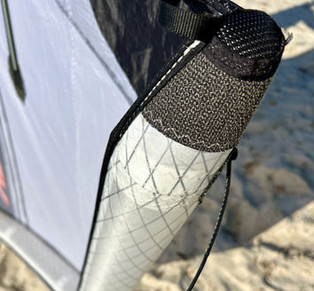 A lot has happened in the materials sector in recent years. Aluula laminate in particular has opened up completely new possibilities in kite design. However the sensitivity of this material has always bothered me which is why I have never wanted to use it for my kites. I wanted a material for the front tube and struts that was not only just as light as Aluula, but also had the same incredibly good strength values, but was also much easier to pack and more durable. The development of stretched PE fibers was just what I needed. The UPE-cloths with this PE fiber have almost the same technical values as Aluula and are even superior in some areas. The combination with the black, laminated Aramid threads results in an extremely tensile material which now gives my kites a completely new riding experience. This makes the kite much more controllable and therefore even more powerful especially in the very upper wind range. Previously my kites had a Dacron cloth for the front tube and struts with around 145 gr/m2. The new cloth is only 85 gr/m2, but is much more stable.
